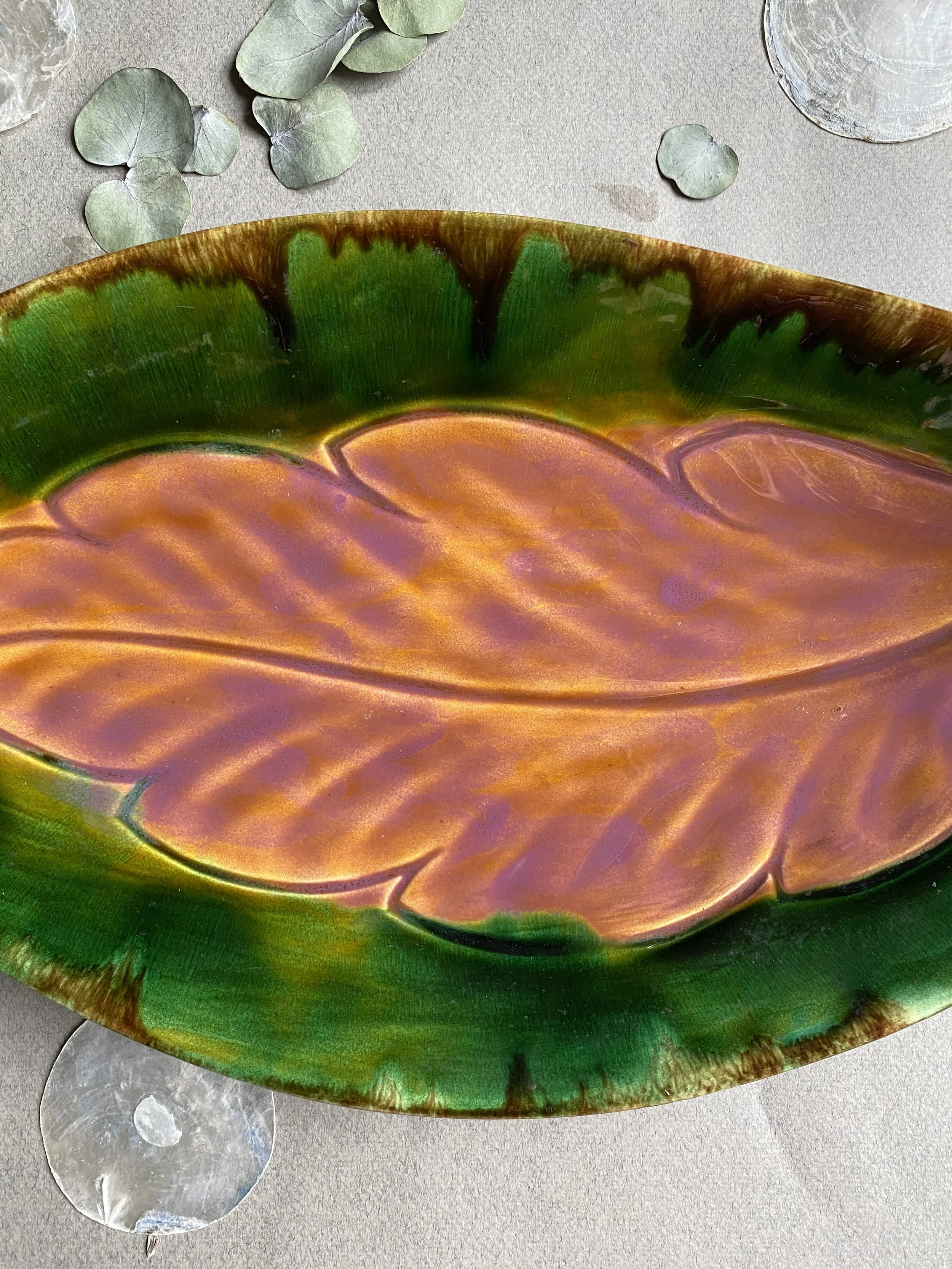 Leaf-shaped ceramic dish, Vallauris pottery (Provence, France), Artist : André Rossello. Barbotine, circa 1960. Green and brown.
